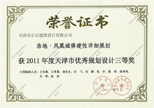 浩地凤凰城修详规获奖证书 日期:2015-04-16  浏览: 106 views 浩地凤凰城修详规获2011年天津市优秀规划设计三等奖