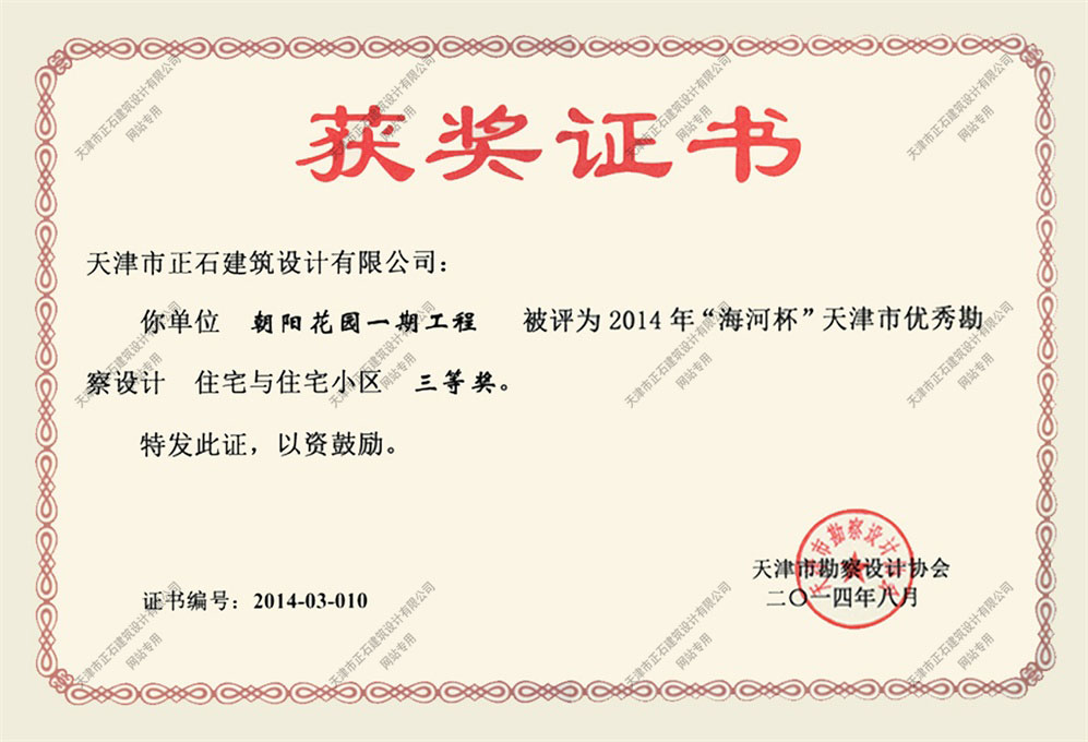 朝阳花园一期工程获奖证书 日期:2015-04-16  浏览: 106 views 朝阳花园一期工程获获2014年“海河杯”优秀设计三等奖