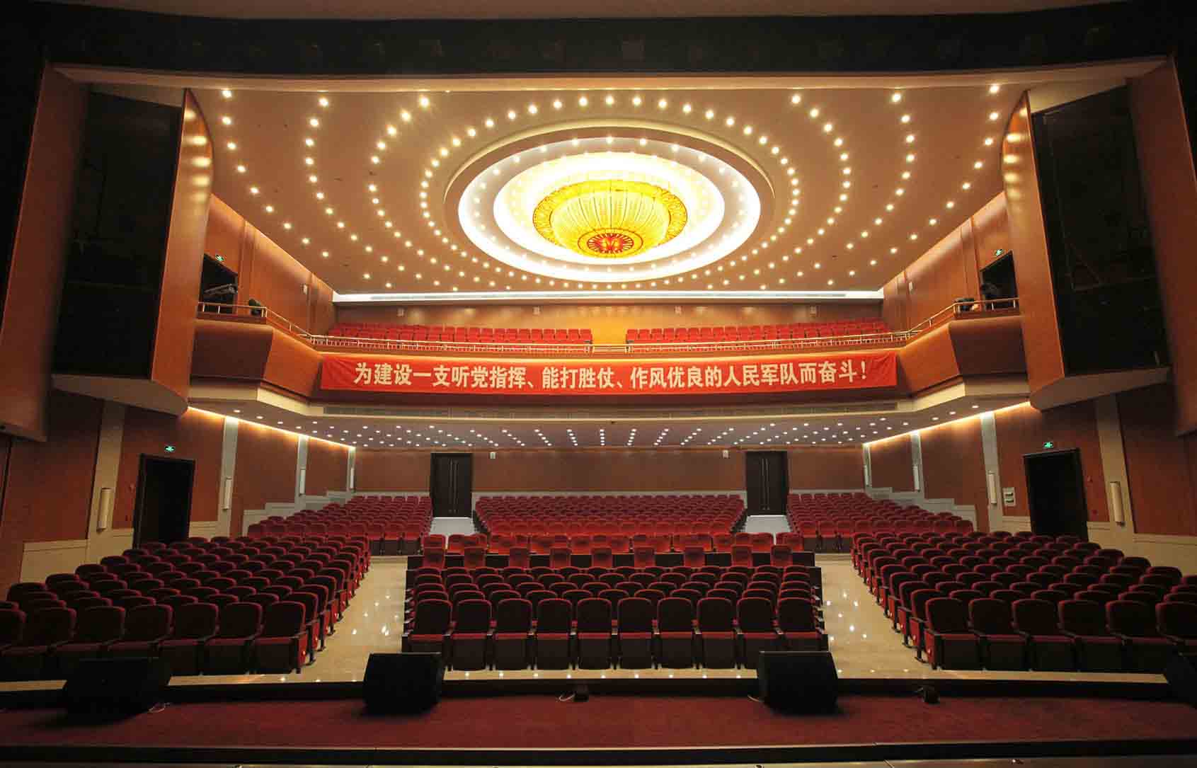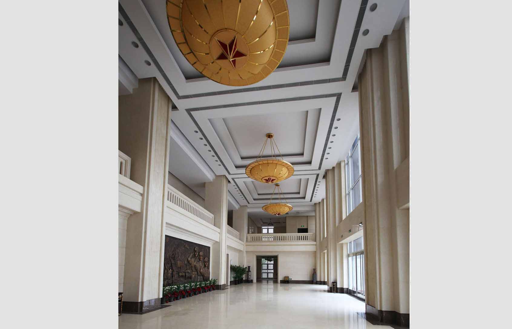 首层平面内布置24.60mx34.40m的礼堂,可容纳810人,内设主席台等。礼堂为实现效果,内部未设置竖向结构构件,为大空间结构形式,同时礼堂上空布置两层展厅,突破了在设计中大空间的礼堂布置在建筑物顶层且上部没有使用功能的常规设计。